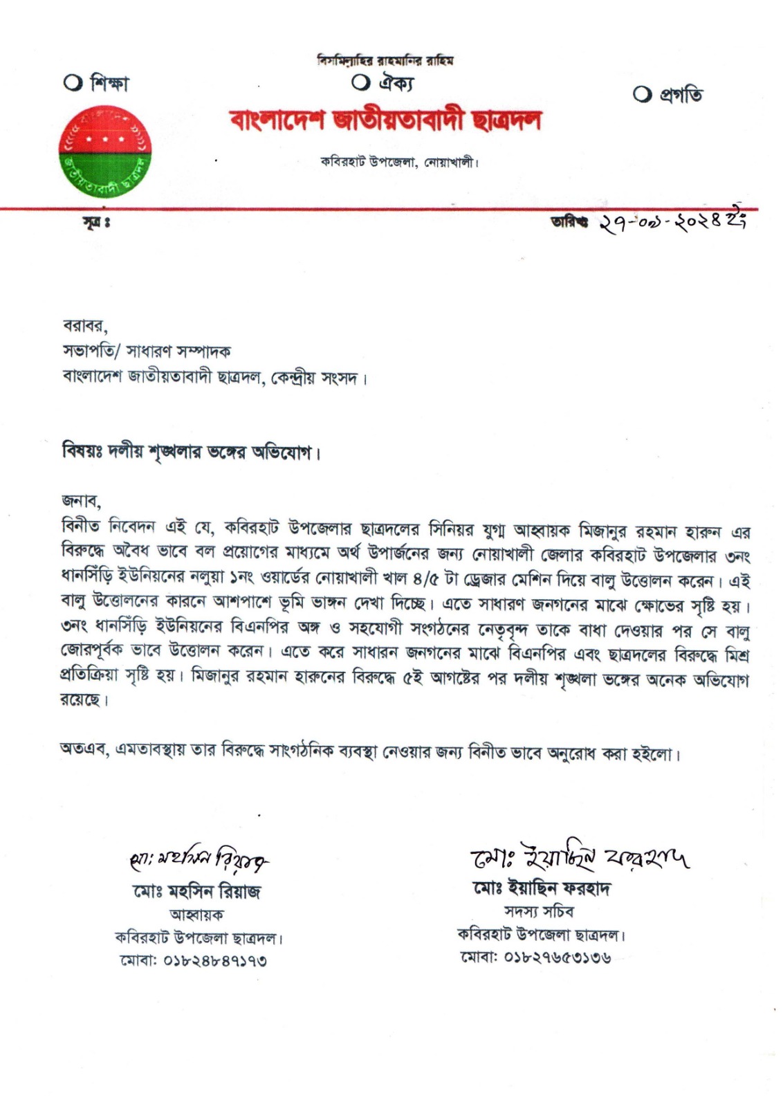 কবিরহাট উপজেলা ছাত্রদলের লিখিত অভিযোগে বলা হয়েছে, কবিরহাট উপজেলা ছাত্রদলের সিনিয়র যুগ্ম আহ্বায়ক মিজানুর রহমান হারুনের অবৈধ ভাবে বল প্রয়োগের মাধ্যমে অর্থ উপার্জনের জন্য উপজেলার ধানসিঁড়ি ইউনিয়নের ১নম্বর ওয়ার্ডের নলুয়া এলাকার নোয়াখালী খাল থেকে ৪/৫টি ড্রেজার মেশিন দিয়ে বালু উত্তোলন করেন। এই বালু উত্তোলনের কারণে আশেপাশে ভূমি ভাঙ্গন দেখা দিচ্ছে। এতে সাধারণ জনগণের মাঝে ক্ষোভের সৃষ্টি হয়। পরে ধানসিঁড়ি ইউনিয়ন বিএনপির অঙ্গ ও সহযোগী সংগঠনের নেতৃবৃন্দ তাকে বাধা দেয়। বাধা দেওয়ার পর সে জোরপূর্বক ভাবে বালু উত্তোলন করেন। এতে করে সাধারণ জনগণের মাঝে বিএনপি ও ছাত্রদলের বিরুদ্ধে মিশ্র প্রতিক্রিয়া সৃষ্টি হয়। অভিযোগ পত্রে আরও বলা হয়, মিজানুর রহমান হারুনের বিরুদ্ধে ৫ আগস্টের পর দলীয় শৃঙ্খলা ভঙ্গের অনেক অভিযোগ রয়েছে।