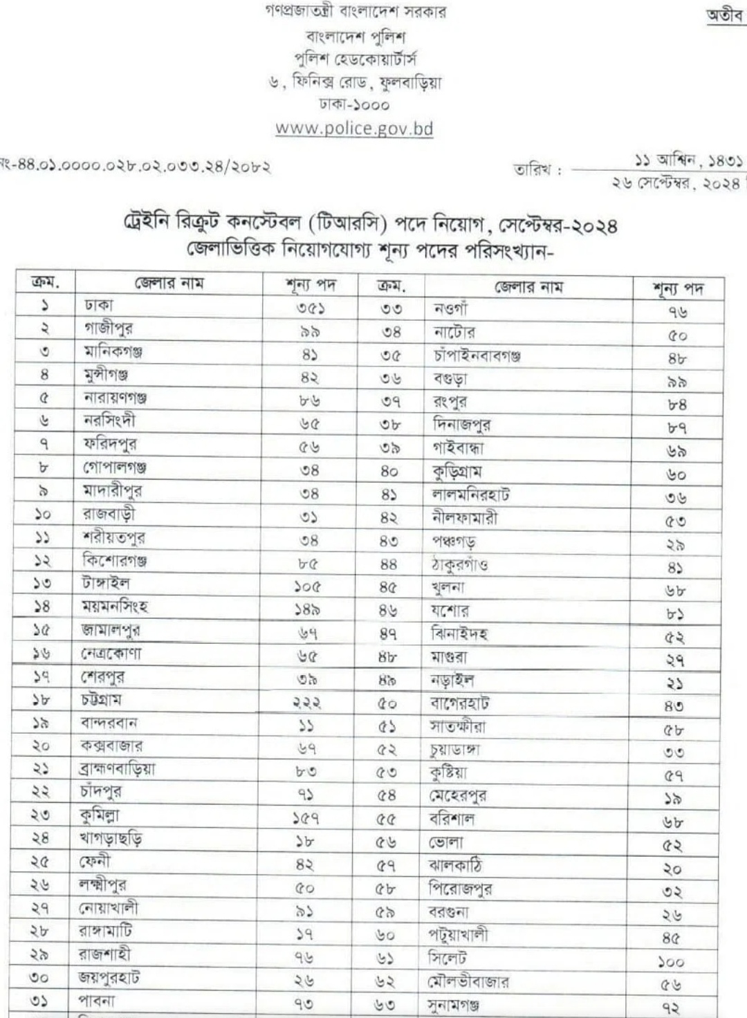 বাংলাদেশ পুলিশের দেওয়া তথ্যমতে, জেলাভিত্তিক শূন্য পদ অনুসারে সবচেয়ে বেশি প্রার্থী নেওয়া হবে ঢাকা জেলা থেকে ৩৫১ জন। এরপর দ্বিতীয় সর্বোচ্চ চট্টগ্রাম জেলা থেকে ২২২ জনকে নেওয়া হবে।