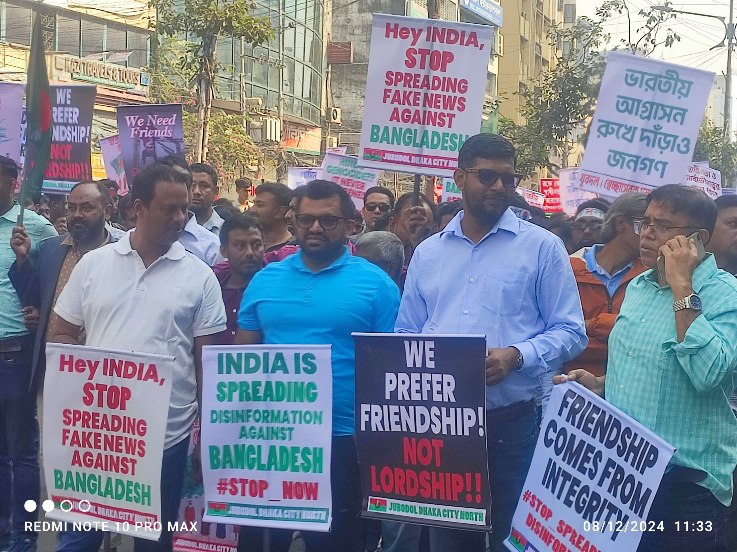 সরেজমিনে দেখা যায়, বিএনপির এই তিন সংগঠনের নেতা-কর্মীরা সকাল ১০টায় নয়াপল্টনে বিএনপির কেন্দ্রীয় কার্যালয়ের সামনে আসা শুরু করেন। এখান থেকে মিছিল নিয়ে বারিধারায় ভারতীয় হাইকমিশনের দিকে যাচ্ছেন নেতা-কর্মীরা। তিন সংগঠন যৌথভাবে এই কর্মসূচি পালন করছে।