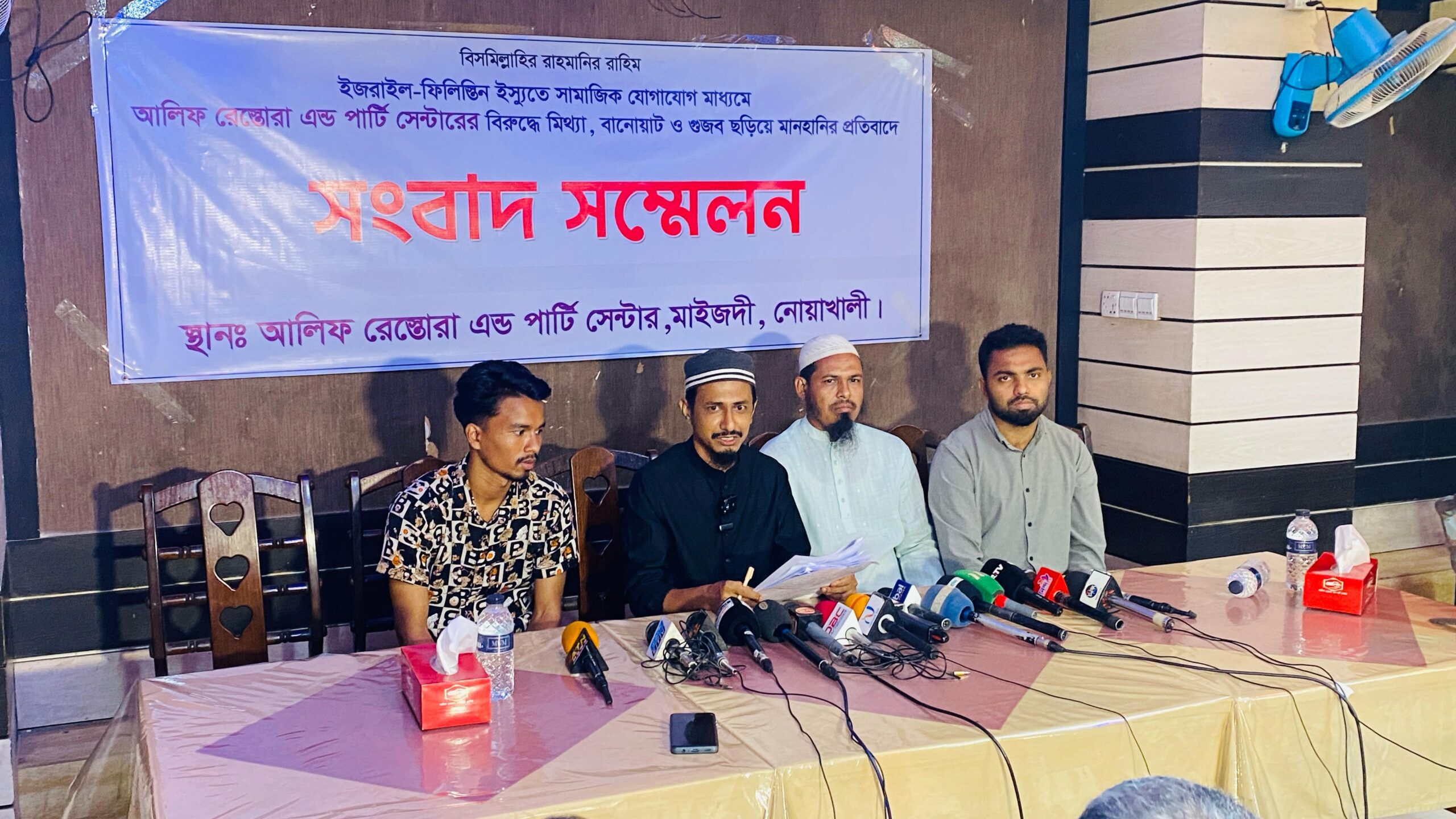 গাজায় আগ্রাসনের প্রতিবাদে দেশব্যাপী ইসরাইলী পণ্য বয়কটের আহবানে সাড়া দিয়ে সারাদেশে বিক্ষোভ মিছিল হয়। ওইসময় দেশের বিভিন্ন স্থানে কয়েকজন দুষ্কৃতিকারী বিভিন্ন প্রতিষ্ঠানে হামলা চালিয়ে ভাঙচুর ও লুটপাট চালায়। এমন সুযোগে নোয়াখালীর আলিফ রেস্তোরাঁ এন্ড পার্টি সেন্টার নামের একটি প্রতিষ্ঠানের বিরুদ্ধে ইসরাইলী পণ্য বিক্রির অভিযোগে এনে ফেসবুকে বিভ্রান্তিমূলক একটি পোস্ট দেয় এক ব্যক্তি। যার ফলে প্রতিষ্ঠানটিতে কর্মরতরা নিরাপত্তাহীনতায় রয়েছে।