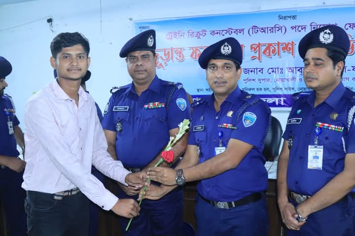 ২৯ মে বৃহস্পতিবার সন্ধ্যা ৬ টায় জনাব মোঃ আব্‌দুল্লাহ্‌-আল-ফারুক, পুলিশ সুপার, নোয়াখালী ও সভাপতি, নিয়োগ কমিটি মহোদয়ের সভাপতিত্বে গঠিত নিয়োগ বোর্ডের সমন্বয়ে নোয়াখালী জেলা হতে বাংলাদেশ পুলিশ ট্রেইনি রিক্রুট কনস্টেবল (টিআরসি) পদে নিয়োগ পরীক্ষার চূড়ান্ত ফলাফল প্রকাশ এবং পরবর্তী করণীয় সম্পর্কে ব্রিফিং প্রদান করেন ।এর আগে ১৯ এপ্রিল ২০২৫ নোয়াখালী জেলা পুলিশ লাইন্স মাঠে প্রার্থীদের শারীরিক মাপ ও কাগজপত্র যাচাই সম্পন্ন করা হয়। ২০ এপ্রিল ২০২৫ প্রার্থীদের Physical Endurance Test (২য় দিনের) কার্যক্রম পরিচালিত হয়। ২১ এপ্রিল ২০২৫ . প্রার্থীদের Physical Endurance Test (PET) এর ৩য় দিনের কার্যক্রম অনুষ্ঠিত হয়। ২০ মে ২০২৫  পুলিশ কে.জি স্কুল এন্ড কলেজ নোয়াখালীতে তিন দিনের শারীরিক সক্ষমতা যাচাই এ উত্তীর্ণ মোট ৪১৭ জন প্রার্থীর লিখিত পরীক্ষা অনুষ্ঠিত হয়।২৯ মে ২০২৫ . সকাল ১০ টায় লিখিত পারীক্ষায় উত্তীর্ণ ৫০ জন প্রার্থী নাম মেধাক্রম অনুযায়ী নাম ঘোষনা শেষে আজ মনস্তাত্ত্বিক ও মৌখিক পরীক্ষা অনুষ্ঠিত হয়। সন্ধ্যা ০৬:০০ ঘটিকায় মনস্তাত্ত্বিক ও মৌখিক পরীক্ষায় অংশগ্রহণকারী ৫০ জন প্রার্থীর মধ্য হতে মেধাক্রম অনুযায়ী চূড়ান্ত ভাবে কৃতকার্য মোট ৪৩ জন প্রার্থীর নাম ঘোষনা করেন নিয়োগ বোর্ডের সভাপতি  মোঃ আব্‌দুল্লাহ্‌-আল-ফারুক, পুলিশ সুপার, নোয়াখালী ।সেবার ব্রতে চাকরি” এই স্লোগানকে সামনে রেখে পুলিশ সুপার  বলেন, টিআরসি নিয়োগ পরীক্ষা, ফেব্রুয়ারি-২০২৫ হয়েছে স্বচ্ছ, নিরপেক্ষ এবং দুর্নীতিমুক্ত। যে সকল প্রার্থী প্রতিটি পরীক্ষায় শারীরিকভাবে যোগ্য, মেধাবী ও সৎ শুধুমাত্র তারাই তাদের যোগ্যতার ভিত্তিতে নিয়োগযোগ্য হিসেবে মনোনীত হয়েছে। পরিশেষে নির্বাচিত প্রার্থীদের ফুল দিয়ে জেলা পুলিশের পক্ষ থেকে আন্তরিক শুভেচ্ছা ও অভিনন্দন জানান এবং চূড়ান্তভাবে উত্তীর্ণ প্রার্থী ও তাদের অভিভাবক অনেকে আবেগপ্রবণ হয়ে তাৎক্ষণিক অনুভূতি ব্যক্ত করেন।এসময় নোয়াখালী জেলার নিয়োগ বোর্ডের সদস্য জনাব মোঃ ওবায়দুর রহমান, অতিরিক্ত পুলিশ সুপার ( ক্রাইম এন্ড অপস্ ), ব্রাহ্মণবাড়িয়া জেলা। জনাব মোঃ জামিলুল হক পিপিএম, সহকারী পুলিশ সুপার (রায়পুর সার্কেল), লক্ষ্মীপুর, উপস্থিত ছিলেন ।নোয়াখালী জেলার অফিসারদের মধ্যে আরো উপস্থিত ছিলেন জনাব আবু তৈয়ব মোঃ আরিফ হোসেন, অতিরিক্ত পুলিশ সুপার ( প্রশাসন ও অর্থ ), নোয়াখালী। মোহাম্মদ ইব্রাহীম, অতিরিক্ত পুলিশ সুপার, (ক্রাইম এন্ড অপস্), নোয়াখালী।  মোহাম্মদ ফয়েজ উদ্দীন, অতিরিক্ত পুলিশ সুপার, (সদর সার্কেল), নোয়াখালীসহ বিভিন্ন পদমর্যাদার অফিসার ও ফোর্সবৃন্দ।