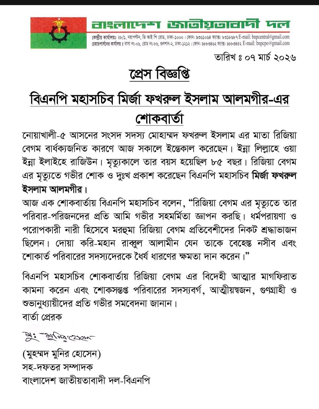 নোয়াখালী-৫ আসনের এমপি ফখরুল ইসলামের মায়ের ইন্তেকাল