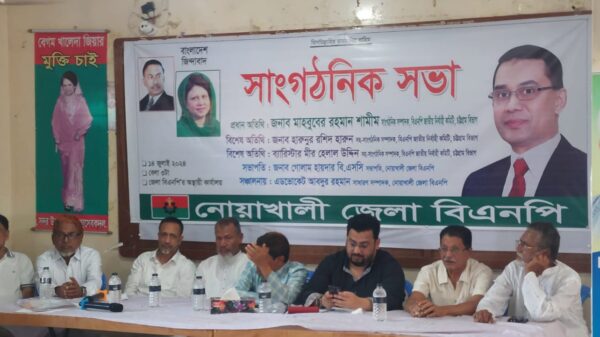 নোয়াখালীর সদর উপজেলায় বিএনপির সাংগঠনিক সভা অনুষ্ঠিত হয়েছে। রোববার (১৪ জুলাই) বিকেলে উপজেলার রশীদ কলোনীর জেলা বিএনপির অস্থায়ী কার্যালয়ে এ সভা অনুষ্ঠিত হয়। নোয়াখালী জেলা বিএনপি এই কর্মসূচির আয়োজন করে।