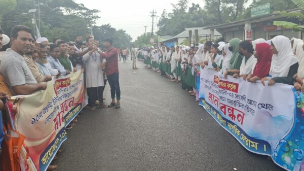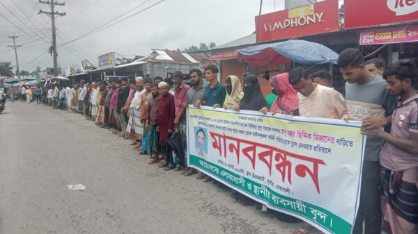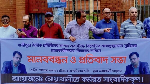 নোয়াখালীতে সাংবাদিক তুহিন হত্যার বিচারের দাবিতে মানববন্ধন।