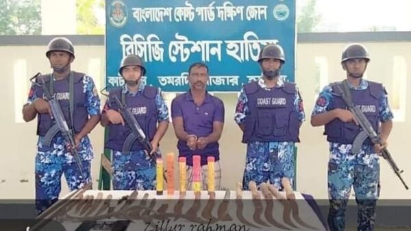 । স্টাফ রিপোর্টার নোয়াখালী হাতিয়া উপজেলায় ডাকাত মহিউদ্দিন কে ৫ টি রকেট ফ্লেয়ার ও বিপুল পরিমাণ দেশীয় অস্ত্রসহ আটক করেছে কোস্ট গার্ড। বেশকিছুদিন ধরে নোয়াখালী জেলার হাতিয়া উপজেলাধীন মেঘনা নদী