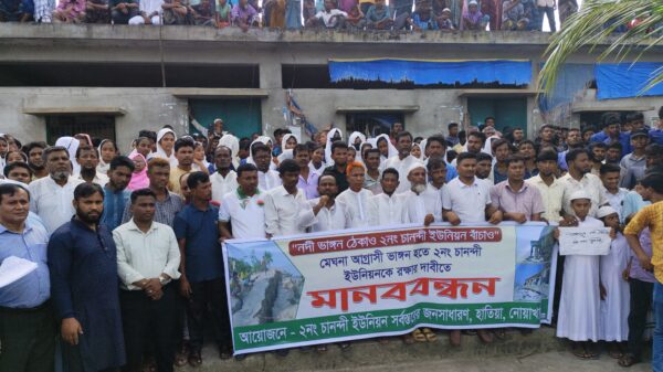 নোয়াখালীর দ্বীপ উপজেলা হাতিয়ায় মেঘনা নদীতে তীব্র নদী ভাংগনের হাত থেকে রক্ষার দাবীতে মানববন্ধন করেছেও সমাবেশ করেছে ভুক্তভোগী এলাকাবাসী। মঙ্গলবার (২৯ অক্টোবর) দুপুরে উপজেলার চানন্দী ইউনিয়নের থানারহাট বাজার এলাকায় মেঘনা