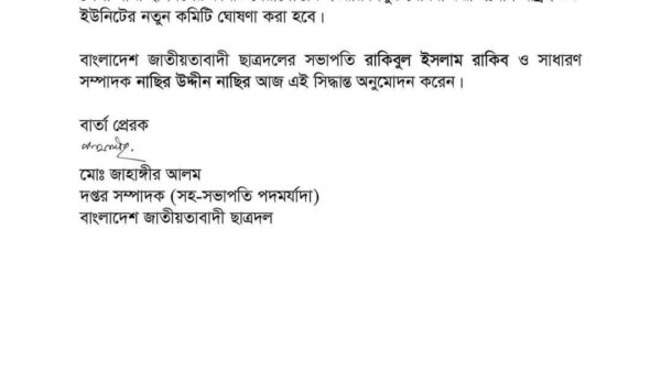 নোয়াখালী জেলা ছাত্রদলের কমিটি বিলুপ্ত ঘোষণা
