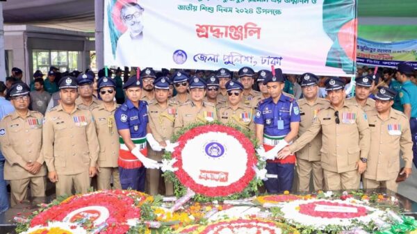 পুলিশের পক্ষ থেকে  বঙ্গবন্ধু শেখ মুজিবুর রহমানের- প্রতিকৃতিতে গভীর শ্রদ্ধা নিবেদন করেন ঢাক জেলা পুলিশ