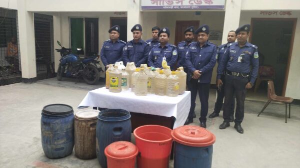 জামালপুর সরিষাবাড়ীতে জামালপুর পুলিশের অতিরিক্ত পুলিশ সুপার (সদর সার্কেল) সোহরাব হোসাইন এর নির্দেশনায় সরিষাবাড়ী থানার অফিসার ইনচার্জ মুশফিকুর রহমান এর নেতৃত্বে পুলিশের বিশেষ অভিযানে ১’শ লিটার মদ ও ৩’শ