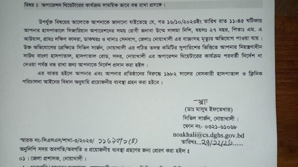 নোয়াখালীর জেলা শহর মাইজদীর সাউথ বাংলা হাসপাতালের অপারেশন থিয়েটার বন্ধ রাখার নির্দেশ দিয়েছেন জেলা সিভিল সার্জন ড.মাসুম ইফতেখার। বুধবার (২৭ ডিসেম্বর) দুপুরের দিকে জেলা সিভিল সার্জন এক লিখিত আদেশে সাউথ
