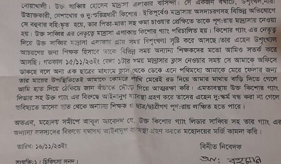 নোয়াখালীর চাটখিলে অষ্টম শ্রেণির এক ছাত্রের মারধরের শিকার হয়েছেন শিক্ষক। বৃহস্পতিবার (১৬ নভেম্বর) ভুক্তভোগী শিক্ষক চাটখিল উপজেলা নির্বাহী কর্মকর্তার কাছে অভিযুক্ত ছাত্রের বিরুদ্ধে লিখিত অভিযোগ দেন। এর আগে, গতকাল বুধবার