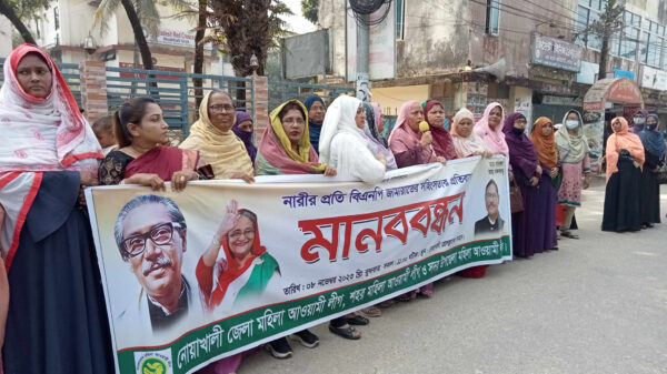 নারীর প্রতি বিএনপি-জামায়াতের সহিংসতার প্রতিবাদ জানিয়ে উন্নয়ন সমৃদ্ধির অগ্রযাত্রা, আগামীর স্মার্ট বাংলাদেশ বিনির্মাণ এবং নারী জাগরণের অগ্রদূত আওয়ামী লীগ সভাপতি শেখ হাসিনাকে আবারো ক্ষমতায় আনতে নোয়াখালীতে নারী সমাবেশ ও মানববন্ধন