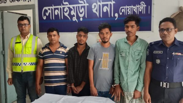 নোয়াখালীর সোনাইমুড়ীতে স্বর্ণ চুরির অভিযোগে ৪ যুবককে গ্রেপ্তার করেছে পুলিশ। গ্রেপ্তারকৃতরা হলেন, উপজেলার নদোনা ইউনিয়নের মৃত নুরুল হকের ছেলে মো.জাকির (৩৫) একই ইউনিয়নের নুর ইসলামের ছেলে আরমান হোসেন (২০) মো.জসিম