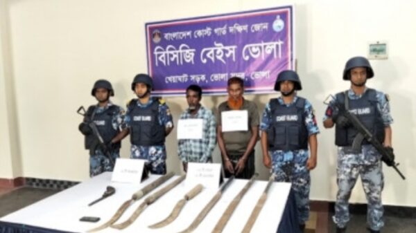 ভোলায় কোস্টগার্ডের অভিযানে একটি পিস্তল ও ছয়টি দেশীয় অস্ত্রসহ একটি ডাকাতদলের সক্রিয় দুই সদস্যকে আটক করা হয়েছে। মঙ্গলবার (৮ অক্টোবর) ভোরে সদর উপজেলার ইলিশা ইউনিয়নের চর রাসেল এলাকা থেকে তাদের