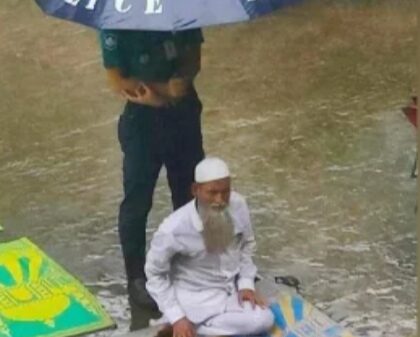 শুক্রবার নামাজরত এক মুসল্লিকে বৃষ্টি থেকে রক্ষা করছেন এক হিন্দু পুলিশ সদস্য
