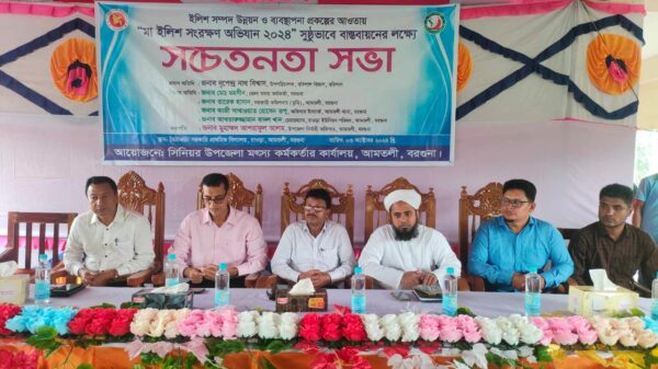 স্টাফ রিপোর্টার – মাসুম বিল্লাহ বরগুনার আমতলীতে ইলিশ সম্পদ উন্নয়ন ও ব্যবস্থাপনা প্রকল্পের আওতায় “মা ইলিশ সংরক্ষণ অভিযান ২০২৪” সুষ্ঠুভাবে বাস্তবায়নের লক্ষ্যে সচেতনতা সভা অনুষ্ঠিত হয়েছে। বৃহস্পতিবার (৩ অক্টোবর)